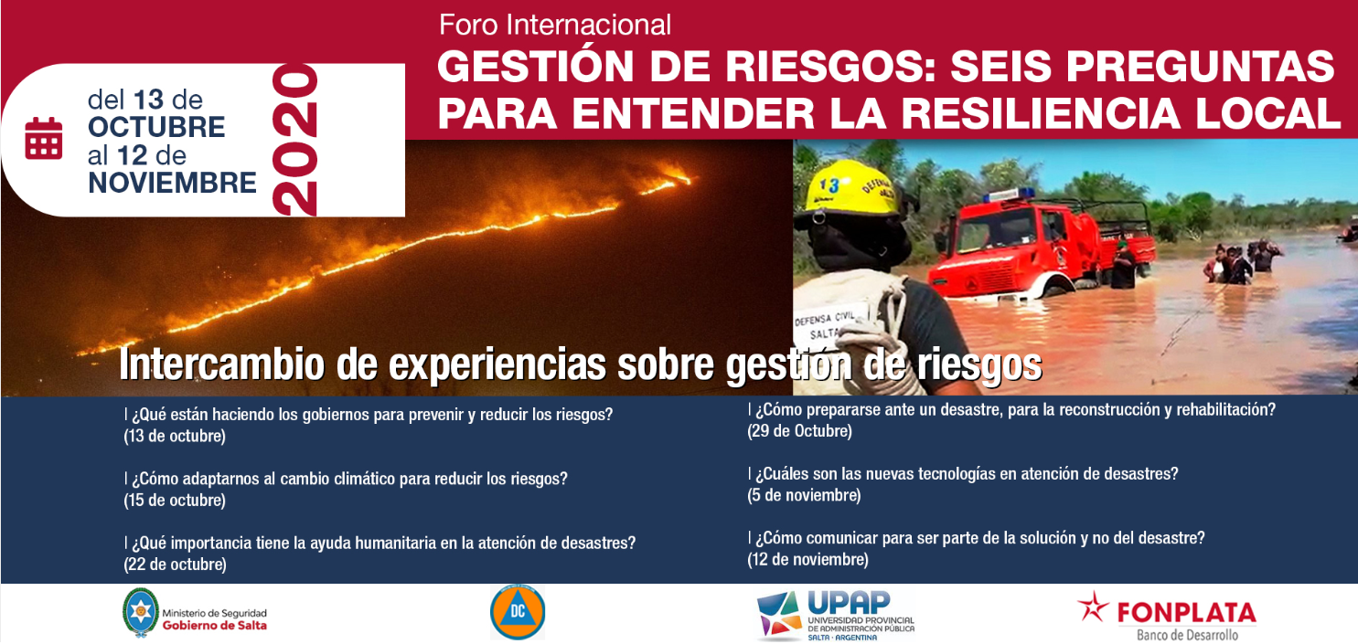 The international online forum: “Risk Management: Six questions to understand local resiliency” started on Tuesday, October 13, the International Day for Disaster Risk Reduction, and aims at creating an environment for exchanging experiences and knowledge on the subject matter, with special focus on the management of public policies, communication, humanitarian aid, resiliency, and reactivation after disaster. Through these exchanges, the Province of Salta seeks to become a significant actor in the region regarding the compliance with the UN Sendai Framework for Disaster Reduction and in accordance with the Sustainable Development Goals (SDG) 2030 Agenda.
