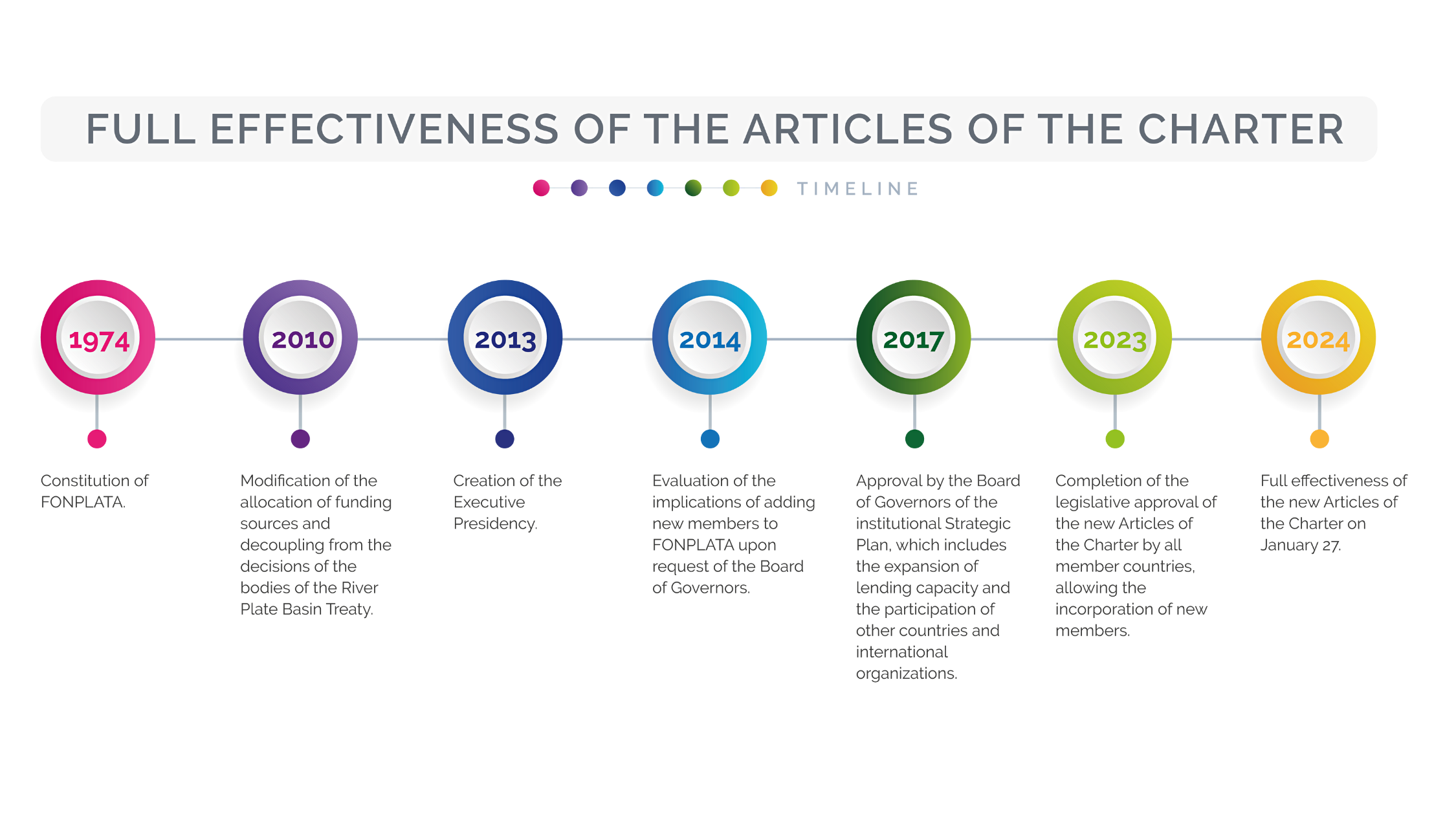 The full effectiveness of the Articles of the Charter takes place in the context of the commemoration of FONPLATA's 50th anniversary and at a historic moment in which all the countries that make up this multilateral development Bank are also part of MERCOSUR. We aspire that, with this momentum, FONPLATA will become the main instrument for advancing integration as a means for the development and harmonious progress of the region.