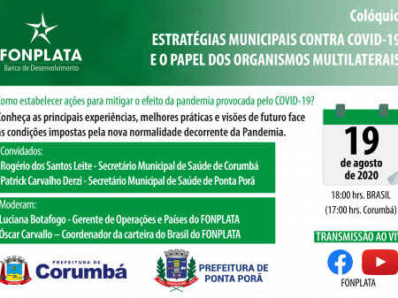 This panel discussion, organized by FONPLATA – Development Bank, will be held on Wednesday, August 19, at 6 pm, Brazilian time (5 pm in Corumbá). This is a free live streaming event on our official channels in Facebook and YouTube. In the panel discussion “Municipal Strategies towards the COVID-19...