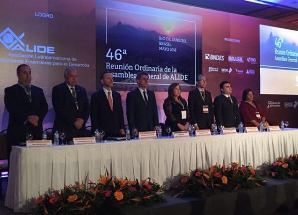 (Río de Janeiro, 18 de mayo de 2016) El Presidente Ejecutivo de FONPLATA, Juan E. Notaro Fraga, junto a la Gerente de Operaciones y Países de la institución, Denise Obara, se hicieron presentes en Río de Janeiro para participar de la 46ª Reunión Ordinaria de la Asamblea General de la Asociación Latinoamericana de Instituciones Financieras para el Desarrollo (ALIDE). Este foro sería la primera participación de nuestro nuevo Gobernador por Brasil, Romero Jucá, Ministro de Planejamento, Desenvolvimento e Gestão en un encuentro multilateral.