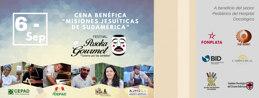 Este menú será presentado el jueves 6 de septiembre en las instalaciones del Hotel Camino Real de Santa Cruz de la Sierra en el evento CENA "MISIONES JESUÍTICAS DE SUDAMÉRICA". Parte de los beneficios de la cena, así como de la subasta de arte que se realizará el día del evento, se donarán al Área de Pediatría del Hospital Oncológico.