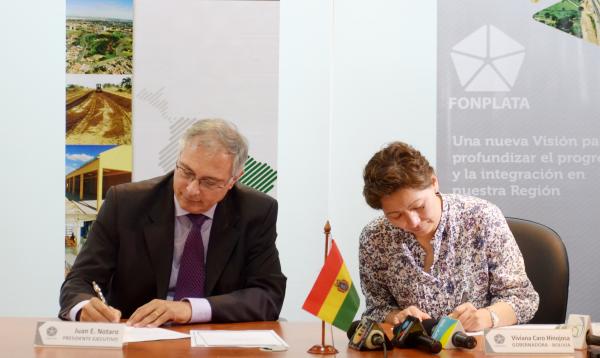 (Santa Cruz de la Sierra, 25 de septiembre) Hoy en las oficinas de FONPLATA, la Ministra de Planificación del Desarrollo, Viviana Caro Hinojosa, y el Presidente Ejecutivo de FONPLATA, Ing. Juan E. Notaro Fraga, firmaron el contrato de préstamo que dará luz verde al proyecto BOL 23/2014, que busca acercar a Bolivia al puerto peruano de Ilo, al posibilitar la construcción de la carretera Nazacara – Hito IV, ubicada en las provincias Pacajes y José Manuel Pando del departamento de La Paz.