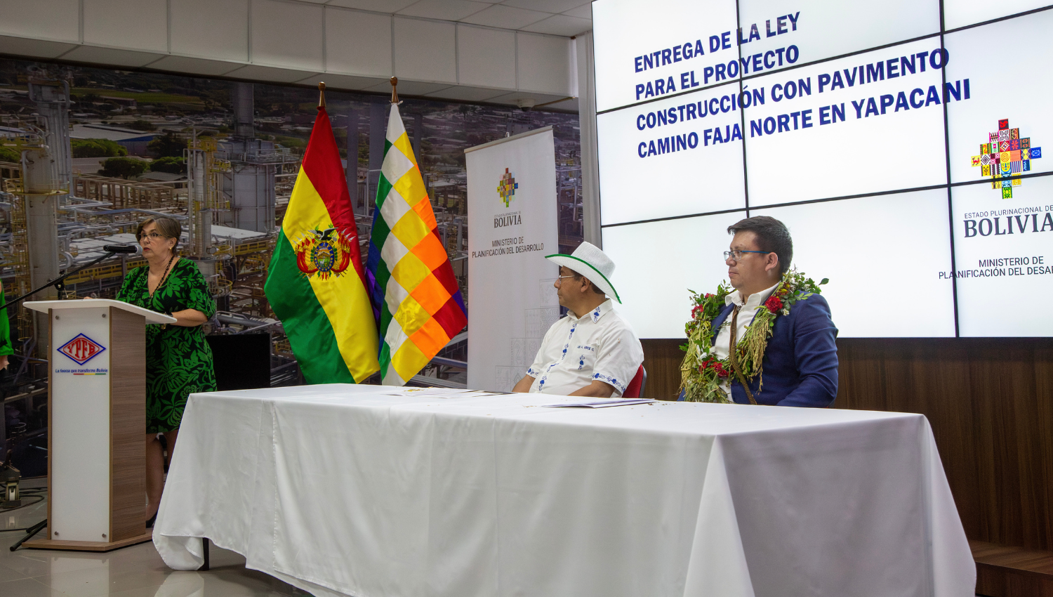 El Presidente del Estado Plurinacional de Bolivia, Luis Arce, en compañía del Ministro de Planificación del Desarrollo, Sergio Cusicanqui, promulgó este 25 de marzo en Santa Cruz de la Sierra, la ley que aprueba el préstamo de 56 millones de dólares financiados por FONPLATA para la pavimentación del camino Faja Norte, en Yapacaní (Santa Cruz). En el acto estuvieron presentes por el Banco de Desarrollo su Presidente Ejecutiva, Luciana Botafogo, y Mariana Prado, Vicepresidenta Ejecutiva.