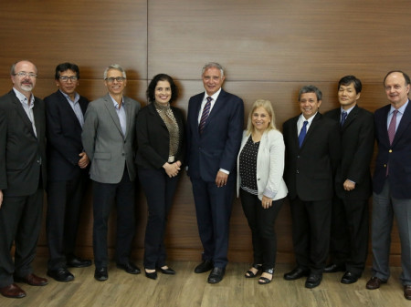 El Presidente Ejecutivo del Fondo Financiero para la Cuenca del Plata, FONPLATA, Juan E. Notaro, junto con el Subsecretario de Relaciones Financieras Internacionales del Ministerio de Hacienda y Director de FONPLATA por la Argentina, Martin Soto, y el Vice-Presidente Ejecutivo del BICE (Banco de...