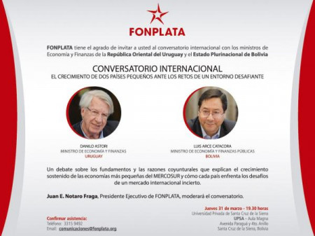 (Santa Cruz de la Sierra, 1 de Abril de 2016) En una conferencia organizada por FONPLATA los Ministros de Economía y Finanzas Públicas de la República Oriental del Uruguay y el Estado Plurinacional de Bolivia, Danilo Astori y Luis Arce, respectivamente, expusieron sobre los elementos fundamentales...