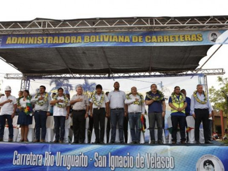 San Ignacio de Velasco, 22 de septiembre. El Presidente del Estado Plurinacional de Bolivia, Evo Morales Ayma, junto al Presidente Ejecutivo del Fondo para el Desarrollo de la Cuenca del Plata (FONPLATA), Juan Notaro, el Gobernador del Departamento de Santa Cruz, Ruben Costas; y otras autoridades...