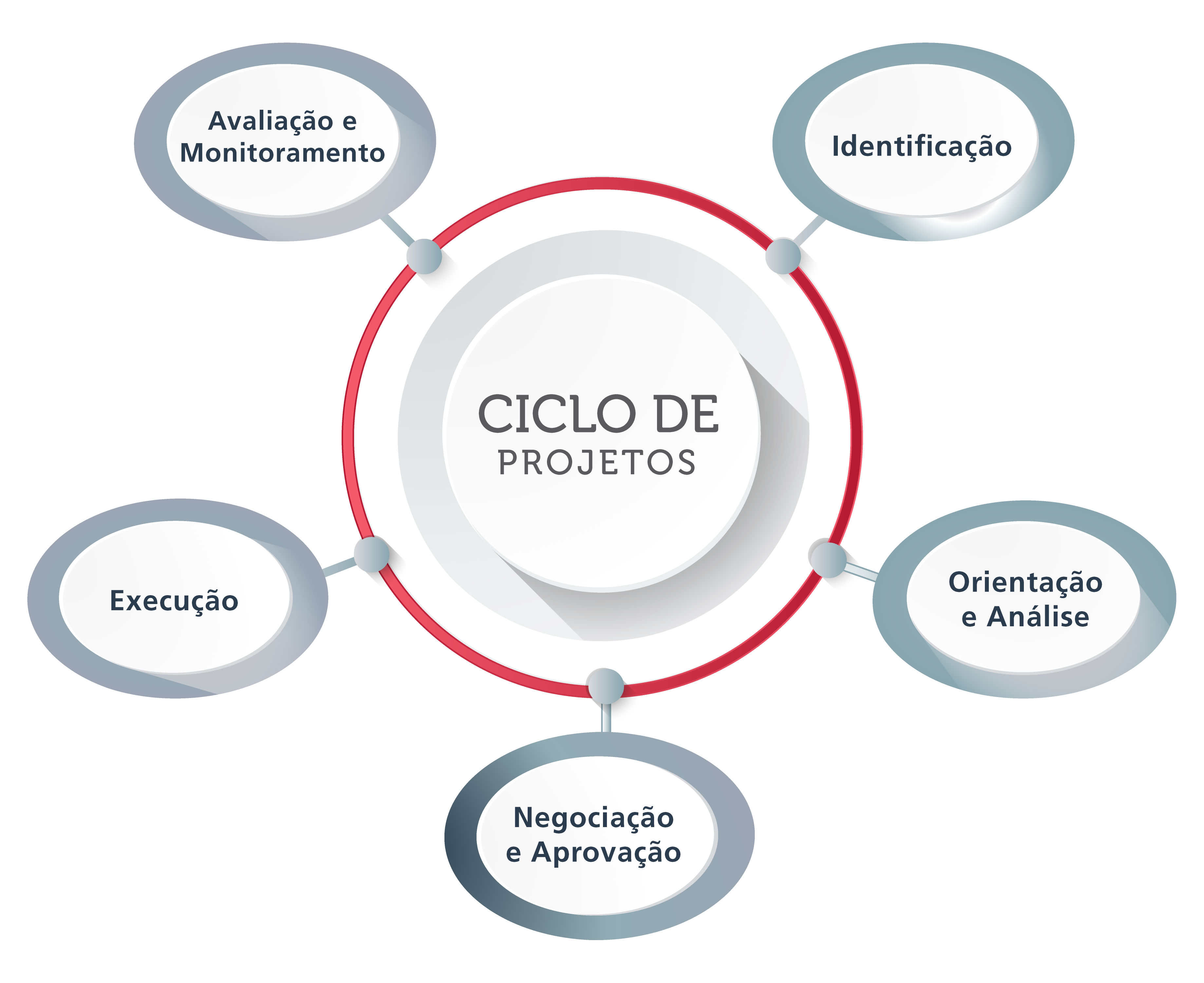 As etapas do ciclo de projeto do FONPLATA, conforme mostra no gráfico abaixo, são: identificação, orientação e análise, negociação e aprovação, execução e avaliação e monitoramento.